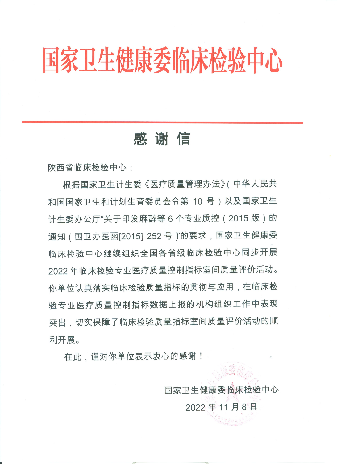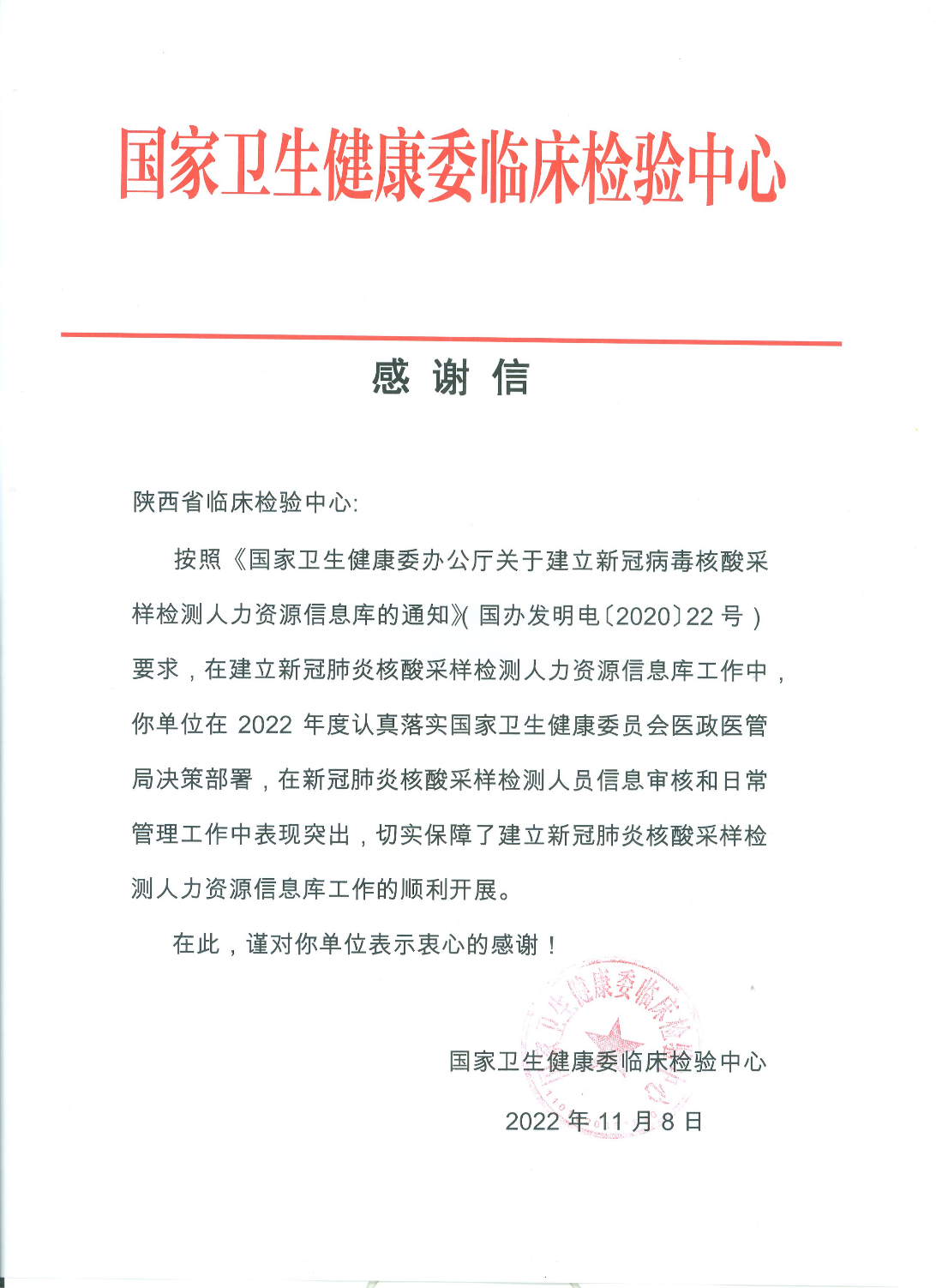 编者按:11月8日,三级片 省临床检验中心连续收到了国家卫生健康委临床检验中心两封感谢信,对三级片 省临床检验中心在临床检验专业医疗质量控制指标数据上报的机构组织工作、新冠肺炎核酸采样检测人员信息审核和日常管理工作中的突出表现表示感谢。