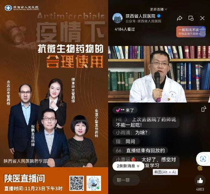 药学部张鹏主任带领朱亚宁副主任药师、方志远主管药师和师亚玲主管药师做客陕医直播间,针对“疫情下抗微生物药物的合理使用”进行热点讨论。