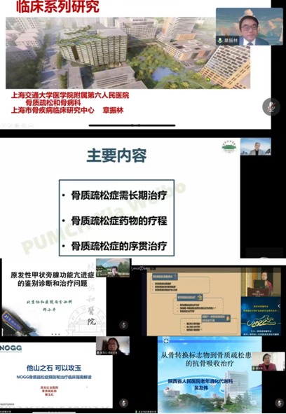 史丽萍教授、吴友伟教授、空军军医大学西京医院夏跃胜教授分别做《NOGG骨质疏松症预防和治疗临床指南解读》《男性骨质疏松症诊疗指南解读》《从骨代谢标志物到骨质疏松的抗骨吸收治疗》《“三高”人群的骨质疏松症防治》主题讲座。下午场,上海市第六人民医院岳华教授、中南大学湘雅二院谢忠建教授、厦门大学附属成功医院梁萌教授、交大一附院马兴教授、三级片