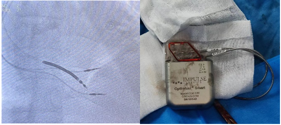 开展的首例新业务,介入手术室吉海鸣主任及王芳云护士长在导管间协调,电生理仪器保障,器械支持,工程师及护士配台方面术前充分准备,术中紧密监测及管理患者生命体征、调控机器正常运行,全程予以强有力的支持。术中,官功昌副主任指导手术团队赵娜副主任医师、李博涛主治医师、王鹏及胡苏进修医生克服ICD导线干扰导线定位障碍、三尖瓣反流导致导线艰难跨瓣等困难,最终顺利植入CCM。术后患者房性心律失常复发,心功能减退,药物复律无效。面临患者双侧锁骨下植入器械、镇静后侧卧位不能配合的困难,官功昌副主任带领医疗组及手术组团队仔细分析,抽丝剥茧,最终采用前后位复律成功,再次规范化调整心力衰竭药物治疗,心功能明显好转,EF值提升至35%。术后一周拆线,患者及家属顺利出院。