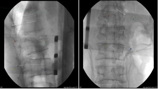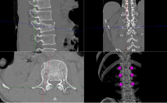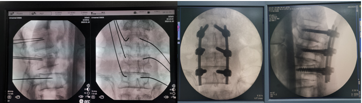 在刘时璋主任精心筹备、悉心安排下,术前手术医生团队和手术机器人技术保障团队密切协作,详细分析了患者腰椎CT资料,精确规划了椎弓根螺钉通道位置及各项参数,重建模拟椎弓根螺钉植入后三维图像,并不断优化方案使其更精准、安全,并进行了手术机器人使用的术前演练。手术当天,常彦海主任医师和陈明副主任医师共同为患者实施了手术。术中,借助C臂获取患者腰椎正侧位影像及标记定位,将其传入机器人系统与患者术前腰椎CT质料匹配映射,确定了每个螺钉的实际穿刺通道,通过机械臂在压力监测和光学追踪引导下依次钻入导针,最后精准植入6枚椎弓根螺钉。脊柱周围毗邻重要神经和血管,椎弓根螺钉通道空间有限,常规经皮植钉技术风险大,容易发生神经损伤等并发症,且术中需要反复透视,手术机器人很好弥补了这些弊端,相当医生有了“透视眼”和“第三只手”,使手术操作更加智能化、精准化。