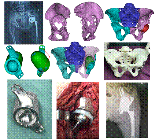 就诊。入院后行三维重建CT后发现,患者髋关节脱位,髋臼假体松动,髋臼内陷入骨盆,并伴有大量的骨溶解及严重的骨缺损。该患者情况复杂,常规翻修方法如颗粒状同种异体骨打压植骨、大块自体骨移植、多孔金属垫块、Jumbo-Cup技术、Cup-Cage技术等均无法取得满意的作用。