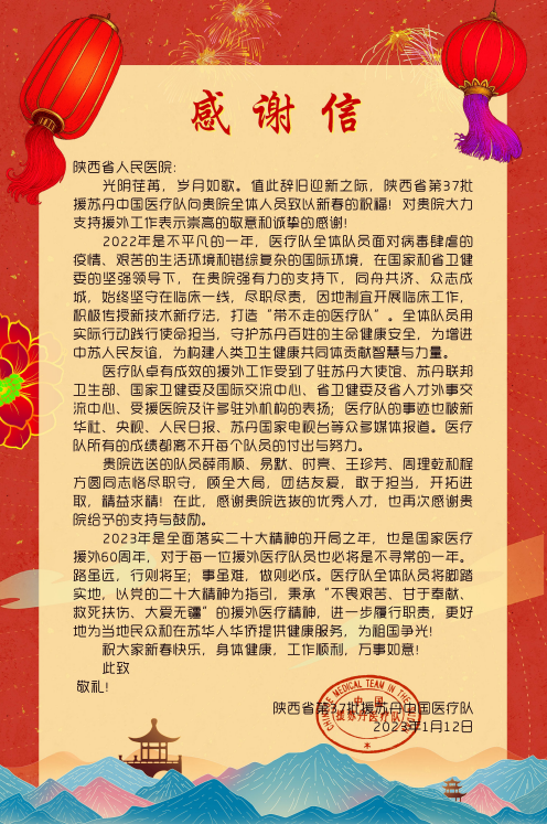 1月12日,陕西省第37批援苏丹中国医疗队向三级片 发来感谢信,感谢医院对援外工作的大力支持及三级片 队员在援外工作中的付出和努力。