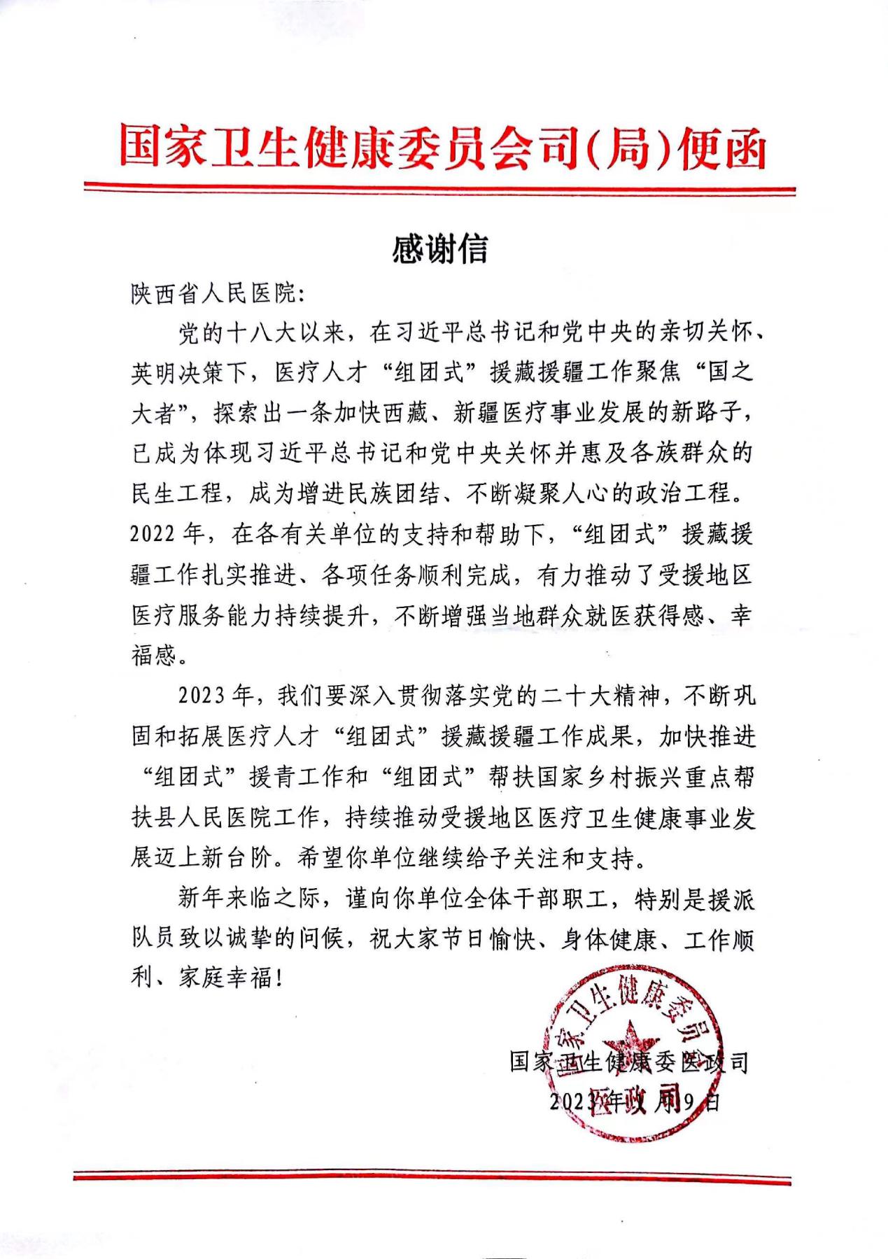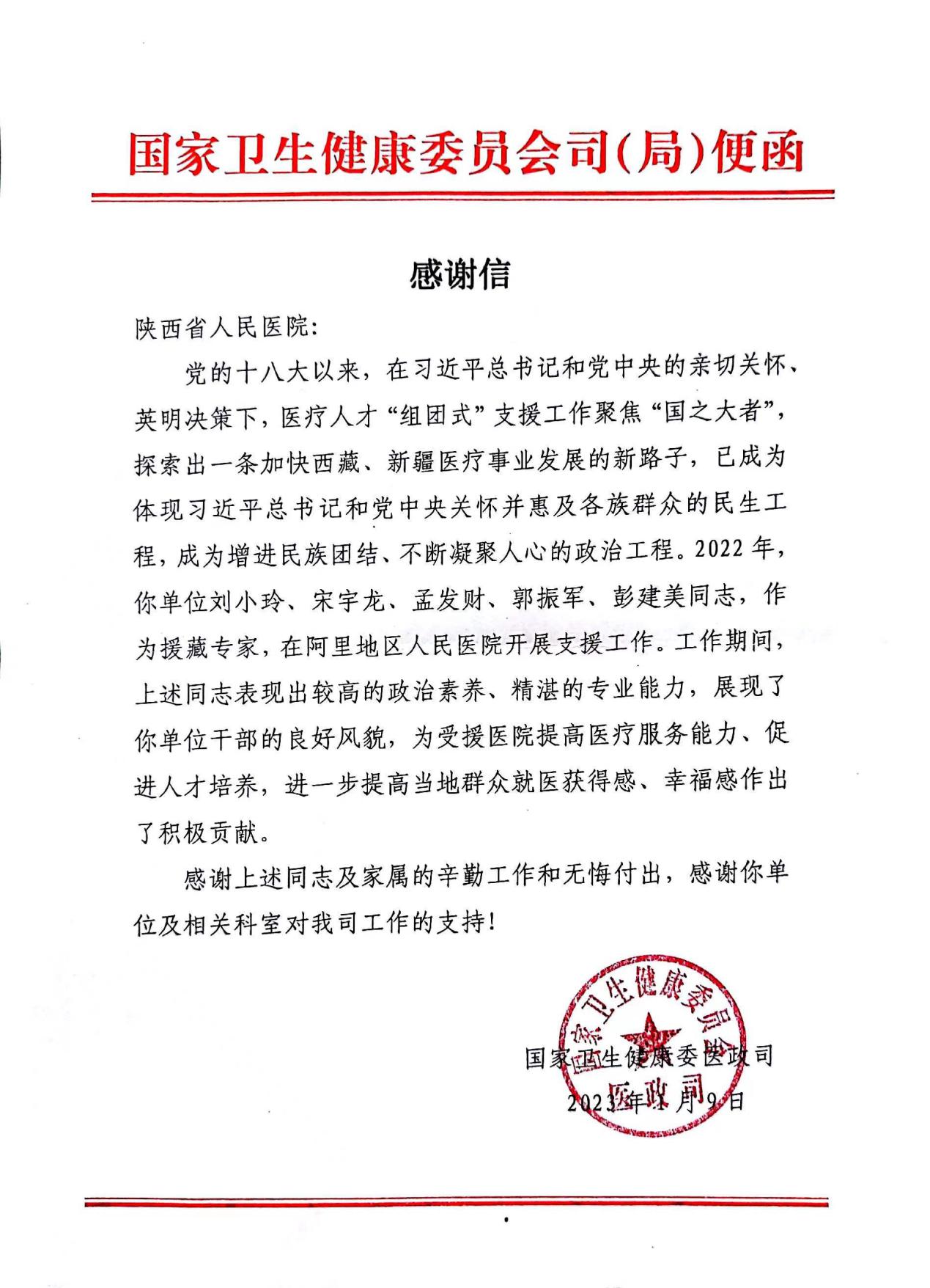 编者按:近日,三级片 收到国家卫生健康委员会医政司发来的感谢信,感谢三级片 自2015年以来开展的“组团式”援藏工作,至今三级片 已累计派出8批16名医疗队员支援阿里地区人民医院,目前仍有5名同志奋战在阿里。