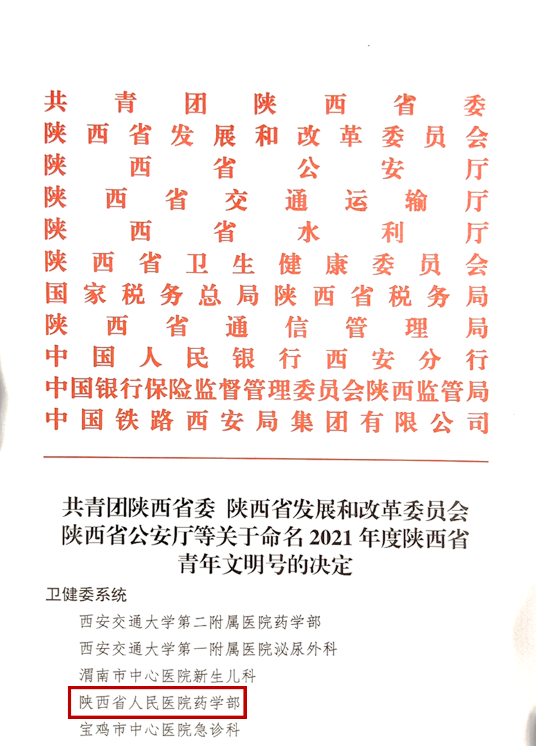 高瞻远瞩,务实创新,建设“创新性”青年文明号。通过信息化助推药师对患者进行个体化用药指导。创新医疗机构药事管理模式及盲人合理用药系统,相关工作获得国家卫健委、中国药学会、陕西省科协、科技厅等部门的各级荣誉十余项。