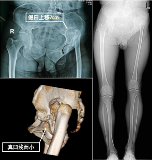 成人发育性髋关节脱位是严重的致残性疾病,常导致跛行、髋关节疼痛及功能障碍,从而丧失劳动能力,手术治疗是极为有效的治疗方法。但是由于患者自幼出现解剖结构异常,情况复杂,尤其对于高位发育性髋关节脱位,手术极具挑战性。患者46岁,因跛行40余年,左髋疼痛5年入院。患者入院后进行了全面的评估,检查发现左下肢较对侧短缩7cm,以至于脊柱及骨盆严重倾斜,影像学检查提示患者左下肢骨骼发育异常,髋臼浅而小,股骨头脱位上移远离真臼位置并坏死变形,股骨颈干角及前倾角明显异常。