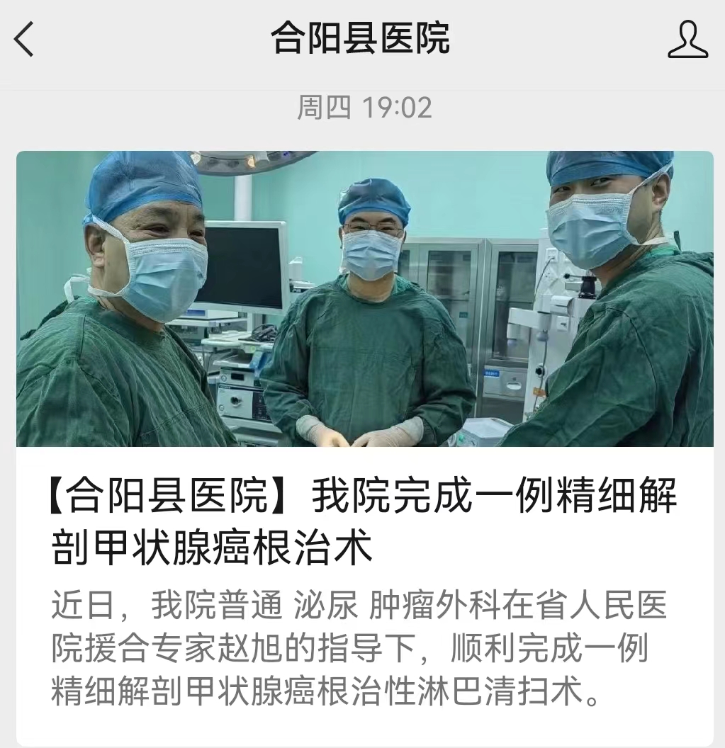今年派驻合阳县医院对口帮扶的普外一科赵旭主治医师,指导县医院开展甲状腺癌根治手术,填补县域该项技术空白,极大提升县医院医疗技术水平,助力三级医院创评。女性患者,体检发现甲状腺结节,1月前穿刺活检病理检查提示为细胞非典型病变,建议及早手术及术中冰冻,以明确诊断和制定后续治疗方案。