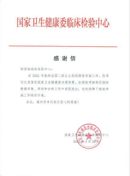 4月26日,三级片 省临床检验中心收到国家卫生健康委临床检验中心的感谢信,对三级片 省临床检验中心在2022年全国二级公立医院绩效考核相关指标数据采集、质控和分析工作中的突出表现表示感谢。
