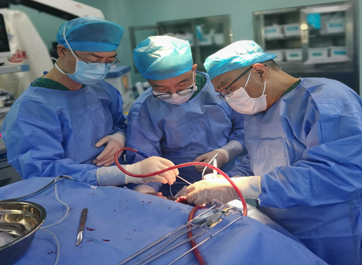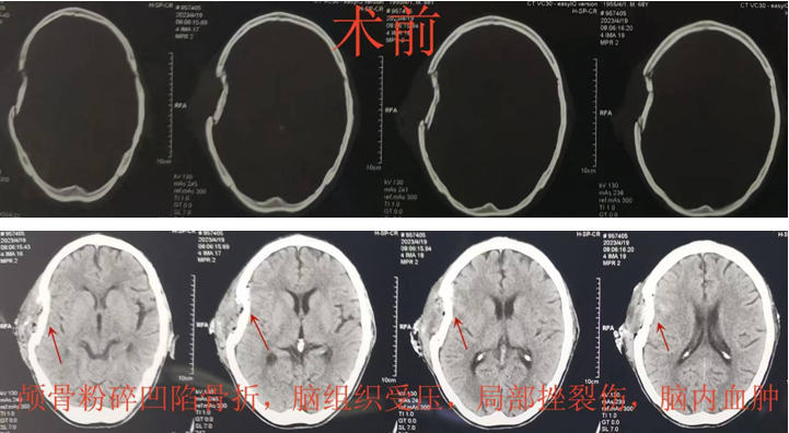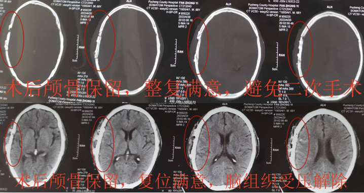 帮扶蒲城县医院的神经外科专家刘晓斌副主任医师,第一时间赶到患者身边进行查看,制订急救方案:患者头皮多处裂伤、颅骨粉碎凹陷骨折,脑组织受压合并挫裂伤等,需要急诊手术解除脑组织压迫,同时考虑到患者高龄,如果去除颅骨,不仅影响后续生活质量,而且二次手术增加创伤风险,并且增加经济负担。刘晓斌副主任医师再三思考,决定行“开颅血肿清除+颅骨粉碎凹陷骨折整复术”。