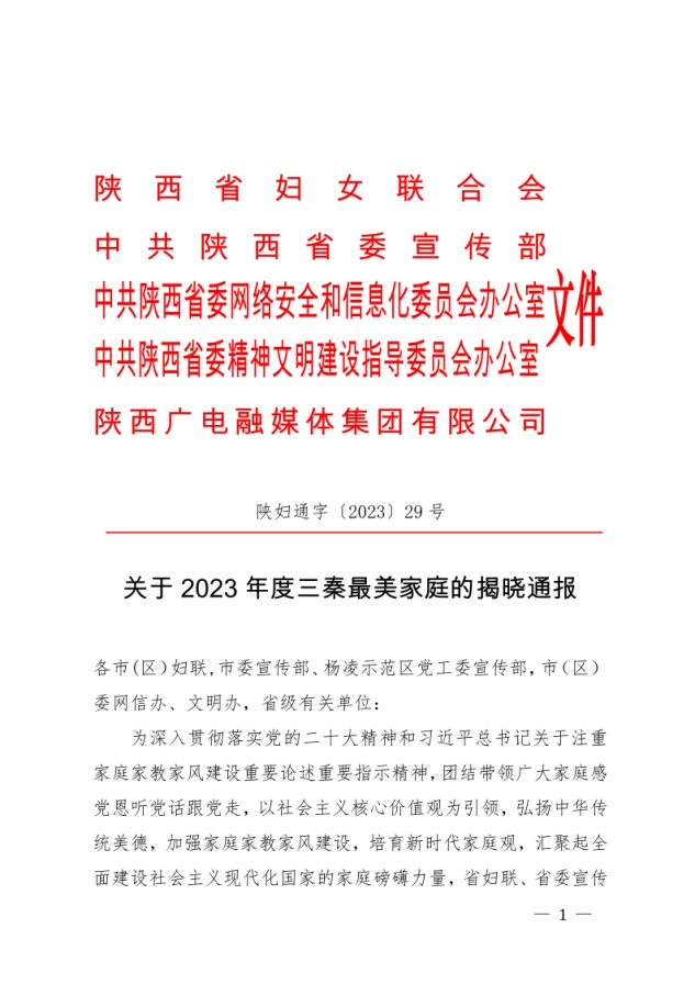 为深入贯彻落实党的二十大精神和习近平总书记关于注重家庭家教家风建设的重要论述重要指示精神,根据省妇联、省委宣传部、省委网信办、省委文明办、陕西广电融媒体集团有限公司联合下发的《关于做好2023年全国最美家庭推荐工作暨寻找三秦“最美家庭”活动的通知》,对照评比参考标准,经院党委研究,院工会考察评议、组织推荐申报,近日,2023年度“三秦最美家庭”名单揭晓,三级片