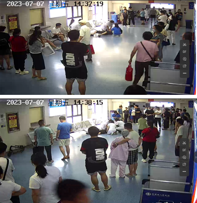 门诊二楼心内科诊区突听一句急促的呼喊。心内科医生赵永勇、分诊护士李娟琴、罗存珍闻声立即飞奔过去,经过判断意识、观察瞳孔、触摸颈动脉搏动等一系列操作,赵永勇医生立即给予患者开放气道,行胸外心脏按压,与此同时,李娟琴护士立即联系急诊抢救室和电梯,14:38分,急诊抢救小组到达抢救现场,急诊医生杜君华,护士宋欢、刘凡祯急诊轮流对患者行胸外按压,大家齐心协力合力施救,共同将患者转移到抢救床,立即转送至急诊抢救室进行后续治疗,目前患者已被转至心血管内一科进一步治疗。