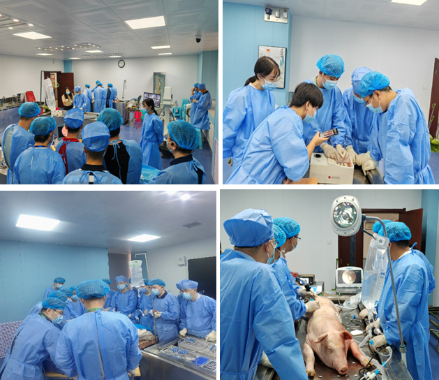 尸体解剖模拟及动物解剖模拟训练分别在实验楼进行。指导老师田大胜教授为大家讲解了模拟操作的要点,结合之前的手术演示和理论授课,从基础的定位、穿刺、建立工作通道等方面展开细心讲解,并对于学员们现场提出的疑问给予耐心解答。学员们在指导老师田大胜教授、刘时璋教授、李全义教授、段大鹏教授、卫文博教授的指导下,在大体标本和动物标本上分别进行规范化手术操作。学员们对这种理论与解剖培训相结合的培训形式给予了高度评价。