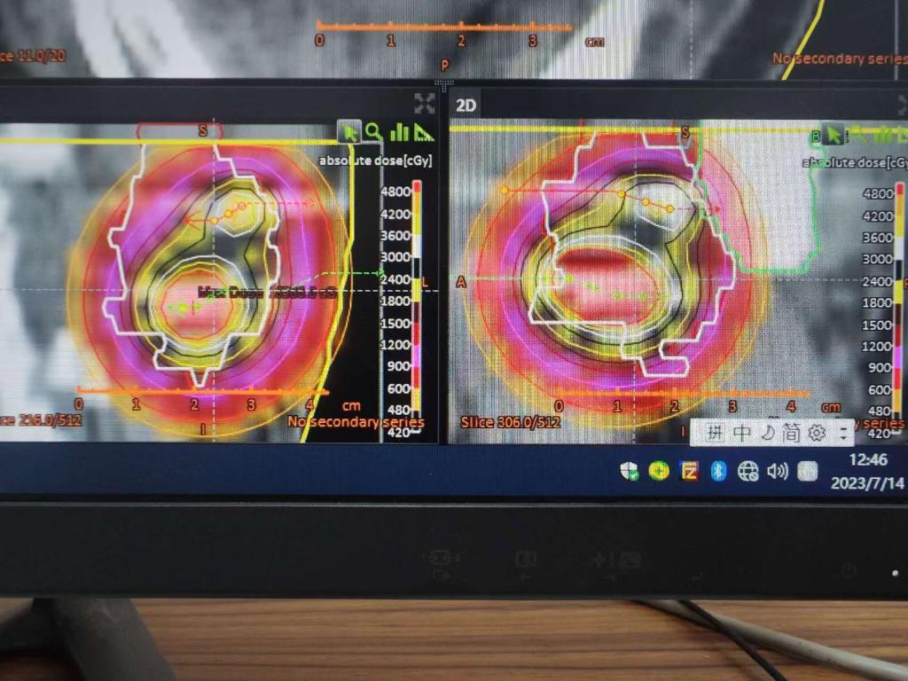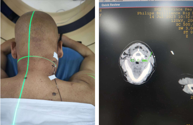如何确定CT引导插植穿刺路径,以精准穿刺到达肿瘤部位攻克复发转移或残留的头颈部肿瘤是临床面临的一大难题。为了应对复发转移及残留的头颈部肿瘤,王青主任医师、陈鑫主治医师及肿瘤内科雷雨副主任医师、陈红蕾护士、张高飞物理师、李宇物理师、刘国强物理师等共同探讨、密切配合,为患者实施高难度后装近距离插植治疗。术前基于该患者CT图像制定插植计划,手术过程顺利,20分钟内完成了2根插植针的置入,术前术后放疗计划吻合,单次给予患者高放疗剂量,肿瘤有效边界区域可达到15Gy,达到精准近距离治疗的目的。