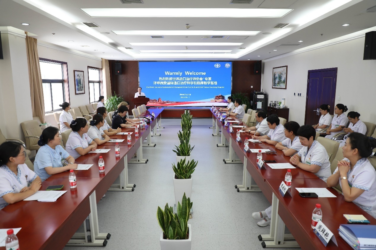 国际造口治疗师临床实践基地进行现场评审。护理部主任吴红娟、门急诊与医技管理处副处长李作彬、普外一科主任阎立昆、烧伤整形医学美容外科副主任慕生枝、总护士长、相关科室护士长及造口伤口专科护理团队参会。会议由泌尿外科护士长赵文彩主持。