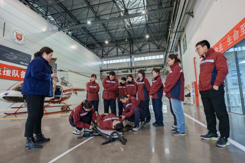 培训中,中国航空医疗救援国际会议组委会主席陈东升老师做《中国航空医疗救援市场发展现状分析和研究》的专题授课,让学员们了解了国内外航空医疗救护发展现状,开阔了视野。中华医学会航空航天医学分会常委兼秘书长王志翔教授授课《航空航天医学基础》,帮助学员为航空医疗救护打好坚实的医学理论基础。秦汉通航飞行员刘天振、航空医疗负责人宋品辉和医疗经理乔炜分别讲授了《影响飞行安全因素及应对措施》《直升机救援程序》和《贝尔407医疗机机舱布局及机载设备》。同时,医疗经理鲜毛毛和乔炜组织参训学员进行了动静态实操,深入了解直升机的患者上下机流程,掌握机载医疗设备操作等技能。