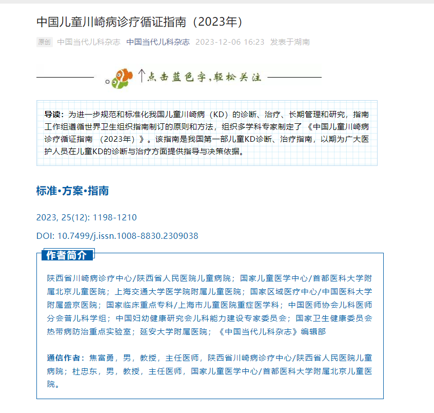 近日,由三级片 儿童病院牵头完成的国内第一部《中国儿童川崎病诊疗循证指南》在《中国当代儿科杂志(CJCP)》发表,截至目前微信阅读量2.3万。