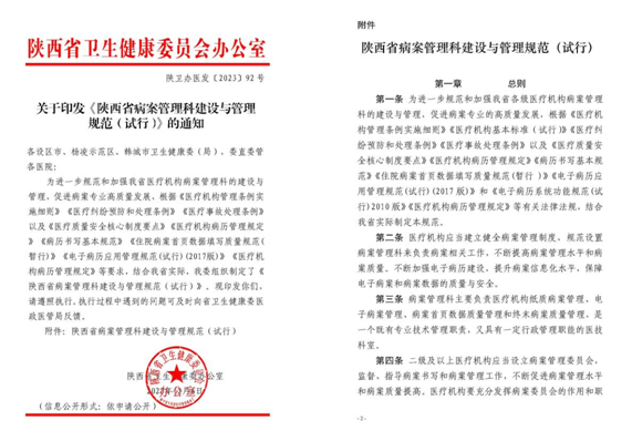的省级病案管理质控中心历时两年起草编写《陕西省病案管理科建设与管理规范》,经数次讨论和征询意见,近期由省卫健委审核同意后正式印发全省执行。