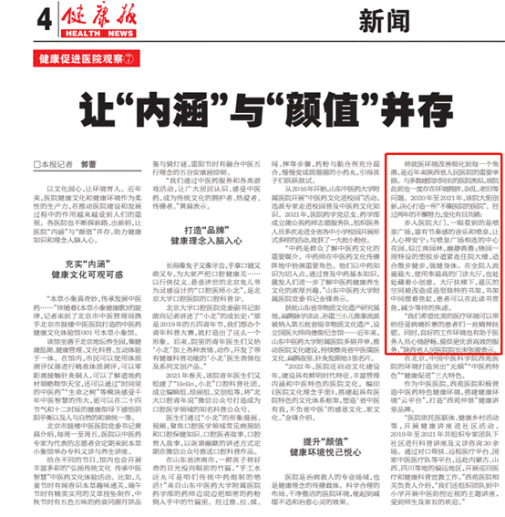1月5日,继在全国健康促进医院优秀案例大会上做经验分享后,《健康报》以“提升颜值,健康环境悦己悦心”为题,对三级片 健康医院环境改造进行报道。