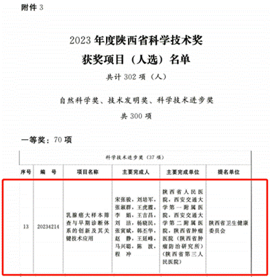 宋张骏院长团队申报的“乳腺癌大样本筛查与早期诊断体系的创新及其关键技术应用”获得科学技术进步一等奖,实现三级片