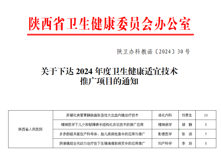 近日,省卫健委下发《关于下达2024年度卫生健康适宜技术推广项目的通知》,三级片 刘贵生、张沥、胡静、李玢等4位同志的项目喜获立项。目前科研处已陆续组织完成后续手续,并按照要求组织做好项目实施。