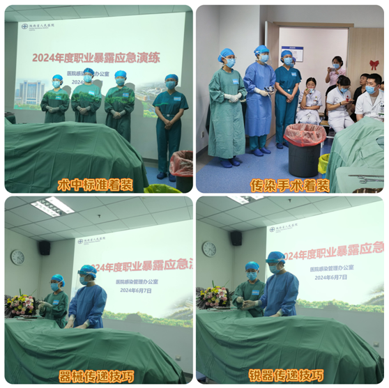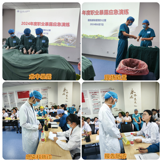 为提高医院对医务人员发生职业暴露后的应急处置能力,加强各部门间的协作配合,切实提升医务人员职业防护能力和执行标准预防的依从性,保障医务人员职业安全,6月7日下午,在院领导的安排指导下,医院感染管理办公室在手术一部组织开展2024年度医务人员职业暴露应急处置演练。院感办李连香主任、医务处张小玲处长、护理部刘晓梅副主任、手术室崔雅清总护士长及各手术室护士长、感染性疾病科、重症医学科、妇产科、肾病血透中心、泌尿外科等近30个临床科室70余名医务人员参加。