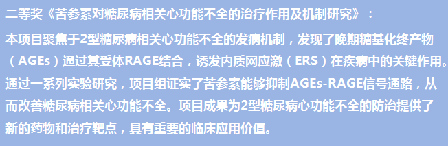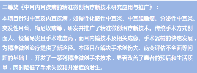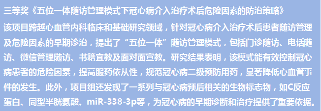 此外,耳鼻咽喉头颈外科张文主任医师主持的“中耳内耳疾病的精准微创治疗新技术研究应用与推广”荣获陕西省科技进步奖二等奖;心内一科刘仲伟副主任医师主持的“苦参素对糖尿病相关心功能不全的治疗作用及机制研究”荣获陕西省自然科学奖二等奖;心内二科程功主任医师主持的“五位一体随访管理模式下冠心病介入治疗术后危险因素的防治策略”荣获陕西省科技进步奖三等奖。
