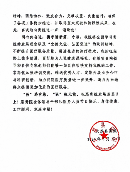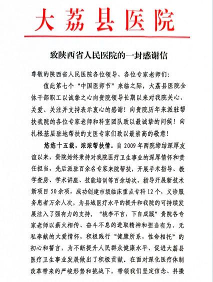2024年8月19日第七个“中国医师节”当天,大荔县医院向三级片 发来感谢信,对三级片 长期以来对大荔县医院的关心关注和大力支持表示衷心感谢!向三级片 历年派驻大荔县医院的帮扶专家和科室团队致以诚挚问候!向扎根基层驻地帮扶的支医专家们致以崇高敬意!感谢信全文如下: