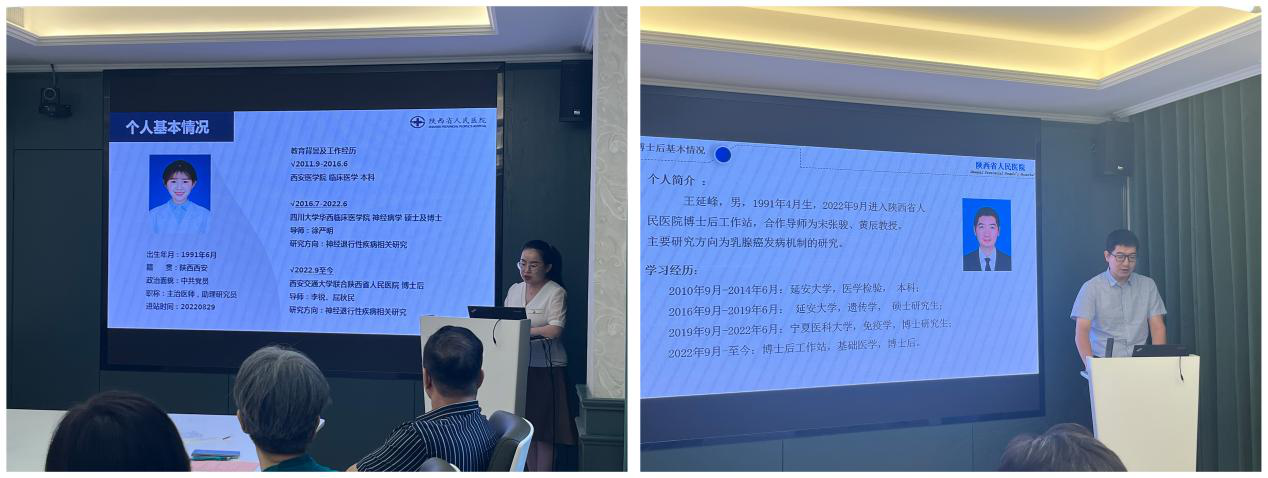 卢兹凡教授、邸伟教授担任答辩评委,张金平博士为答辩秘书。答辩会上,宁萍萍、王延峰两位博士后分别就其在站期间科研工作进行了精彩汇报。考核评审专家组经过深入论证和严谨质询,一致认定两人完成研究任务,达到了培养协议中的学术成果指标,指出其在答辩过程中表述条理清楚、思路清晰、报告内容丰富、方法科学得当,展现出了独立的科研能力,成功通过出站考核。此外,各位评委还对两位博士后的课题提出了进一步的建议和新的研究思路。