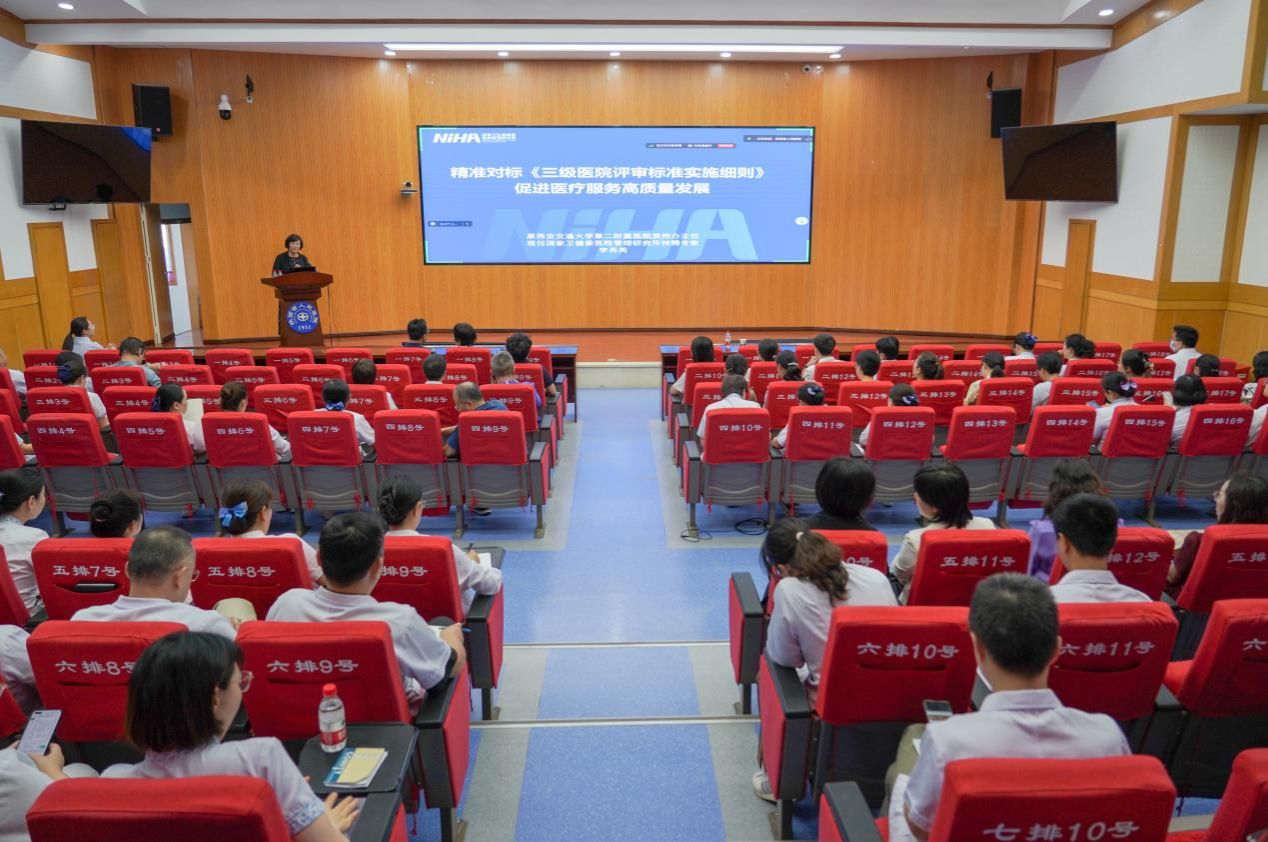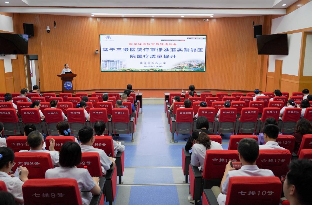 为准确理解等级评审标准实施细则,深入落实“质量、安全、服务、管理、绩效”的评审主题,进一步加强科室医疗质量安全管理,9月5日下午,等级复审办公室邀请国家医院管理研究所特聘专家来院做《基于三级医院评审标准落实赋能医院医疗质量提升》的专题讲座。全院临床医技科室主任、业务副主任、护士长、业务副护士长以及医务处、护理部、门急诊与医技管理处、大数据中心等职能部门工作人员共计200余人参加培训会。