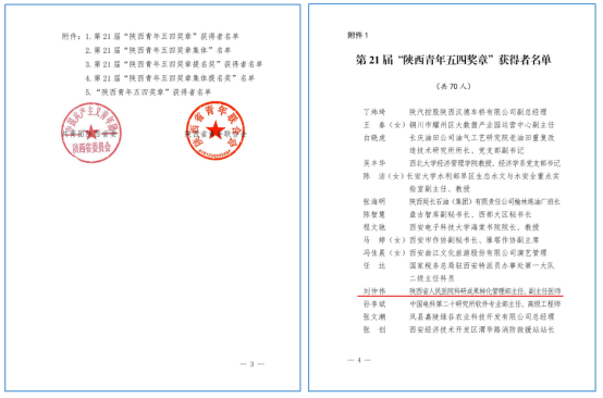 优秀青年医师刘仲伟光荣上榜,被授予第21届“陕西青年五四奖章”。