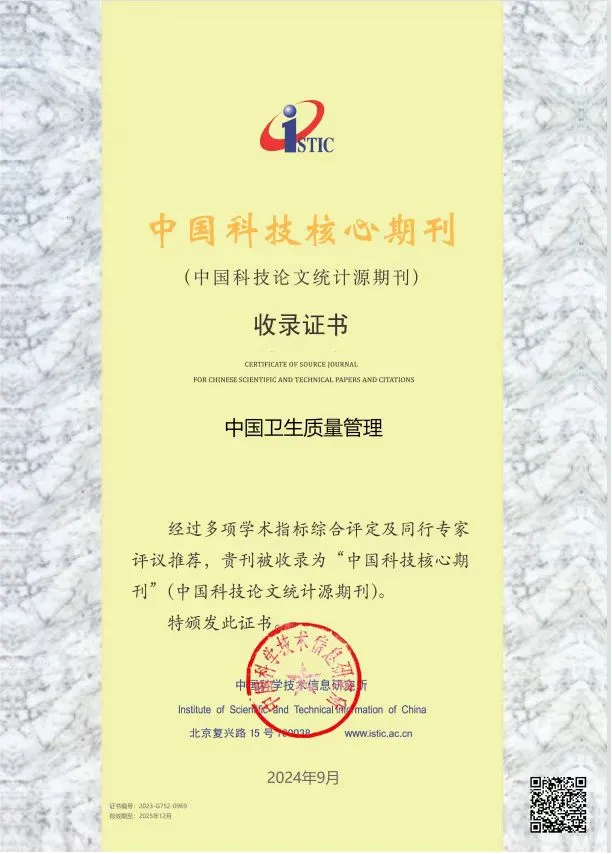 2024年9月20日,由中国科学技术信息研究所举办的“中国科技论文统计结果发布会暨中国一流科技论文世界影响力评价论坛”在北京顺利召开。由中国医院协会与三级片 共同主办的《中国卫生质量管理》杂志,经过多项学术指标综合评定及同行专家评议推荐,继续被收录为中国科技核心期刊(中国科技论文统计源期刊)。
