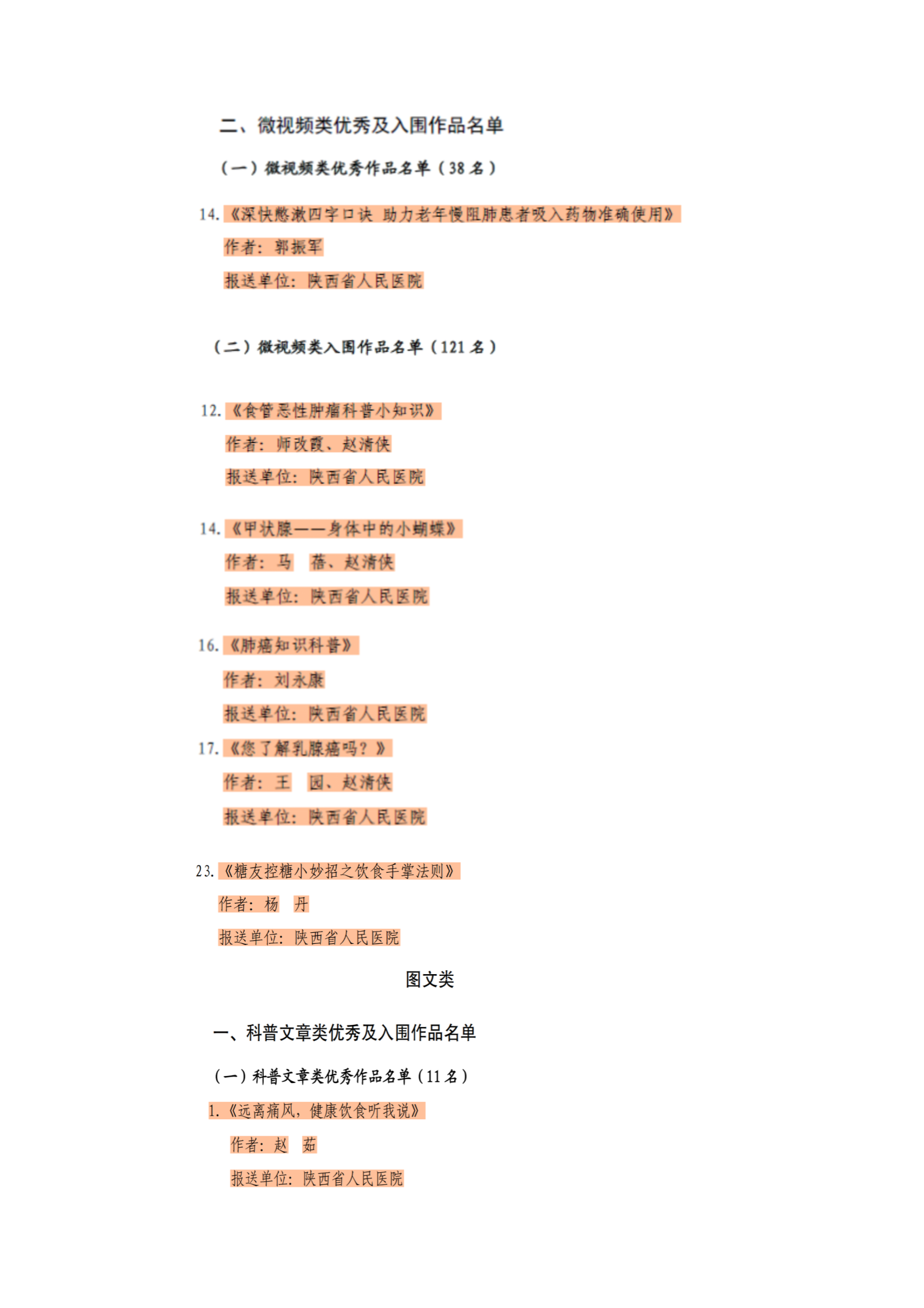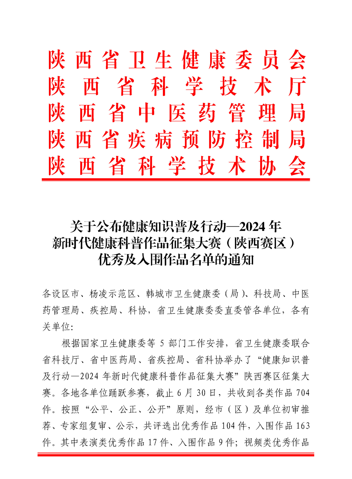 近日,陕西省卫生健康委员会、陕西省科学技术厅、陕西省中医药管理局、陕西省疾病预防控制局、陕西省科学技术协会联合发布《关于公布健康知识普及行动——2024年新时代健康科普作品征集大赛(陕西赛区)优秀及入围作品名单的通知》,三级片