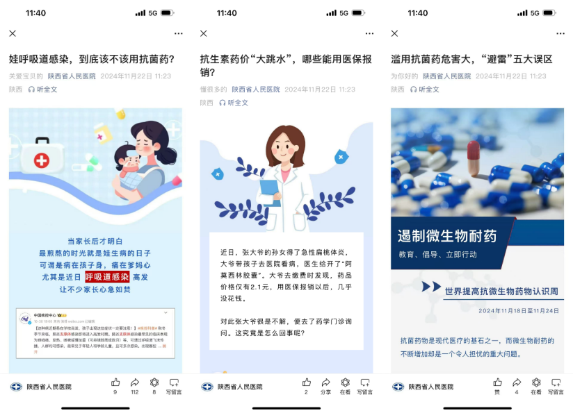 除了社区宣教义诊和专题讲座外,药学部还通过多种渠道开展了科普宣传活动。主院区及西咸院区的门诊大厅宣传电子屏滚动播放“世界提高抗微生物药物认识周”宣传视频,面向门诊患者科普抗微生物药物的合理使用。同时,还围绕抗菌药物的使用误区、儿童抗菌药物合理使用、抗菌药物医保限定支付等内容撰写了3篇科普文章,并发布于医院微信公众号。通俗易懂、内容丰富的科普文章和视频不仅提升了患者对抗微生物药物的认识,更有助于抗微生物药物的规范使用。