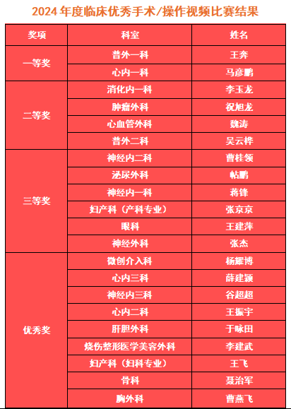 医务处张小玲处长宣布了获奖名单,她表示,临床优秀手术/操作视频大赛不仅是对选手手术技能的检验,也进一步激发广大医护人员钻研技术业务的热情,不断提高全院各专科技术操作水平。医院将继续秉持 “精研医术、守正创新、优化服务、谋求发展” 的理念,以赛提质,强化手术风险管理、提升医疗质量安全,更好地服务百姓健康。