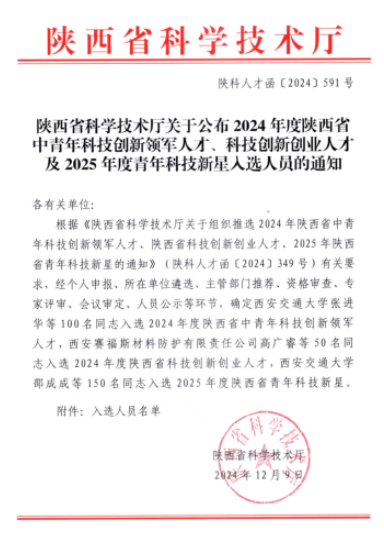 近日,陕西省科学技术厅公布了《2024年度陕西省中青年科技创新领军人才、科技创新创业人才及2025年度青年科技新星入选人员的通知》(陕科人才函〔2024〕591号),三级片