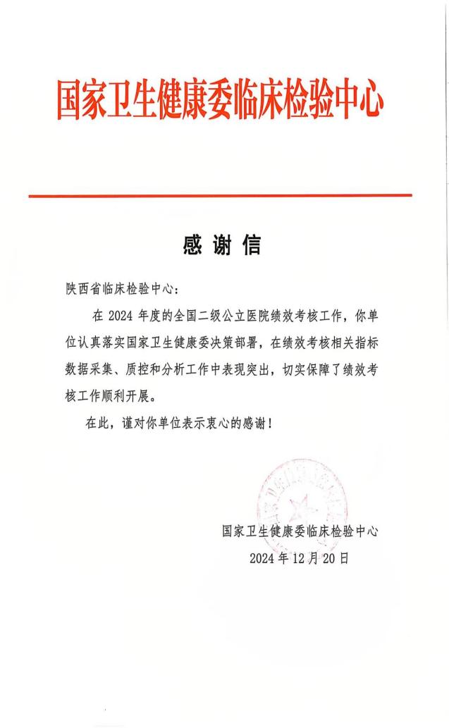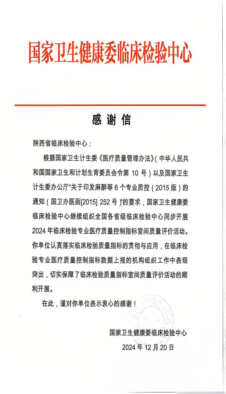 12月20日,三级片 省临床检验中心收到国家卫生健康委临床检验中心发来的两封感谢信。信中对三级片 省临床检验中心在临床检验专业医疗质量控制指标数据上报的机构组织工作以及全国二级公立医院绩效考核相关指标数据采集、质控和分析工作中的突出表现表示感谢。