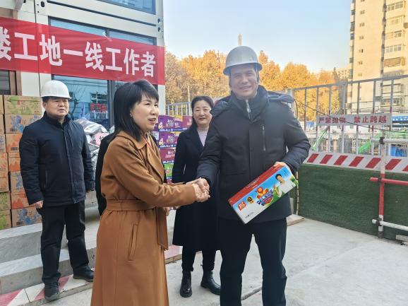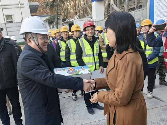 随后,张玉莲书记亲自向项目部的参建代表分发慰问品,将一份份承载着医院关怀的礼品送到大家手中,现场响起了阵阵掌声,让在寒冬中坚守岗位的工作人员感受到了浓浓的暖意。陕建八建集团总经理经理王勋表示,“感谢医院领导的关心和支持,我们一定不辜负医院领导的期望,进一步加强项目管理,优化施工组织,确保项目按时、高质量交付使用,为医院的发展贡献我们的力量。”