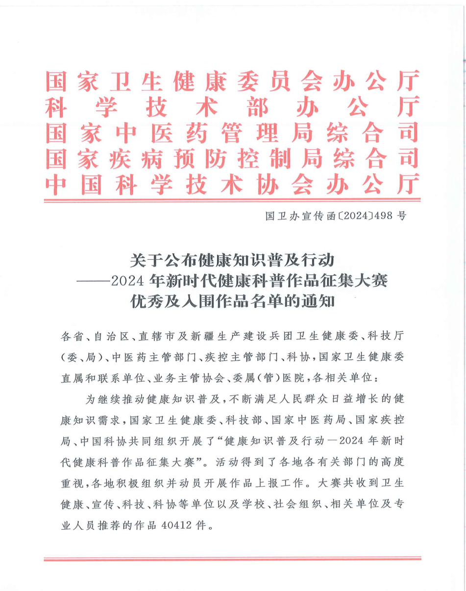 日前,国家卫生健康委、科技部、国家中医药管理局、国家疾控局、中国科协联合举办了健康知识普及行动——2024年新时代健康科普作品征集大赛。近日结果公布,三级片