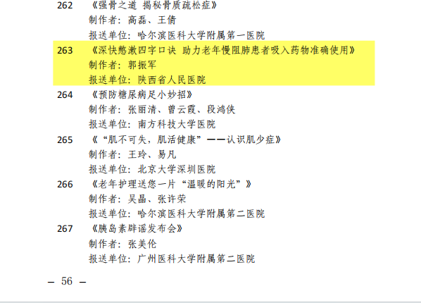 药学部郭振军创作的科普视频《深快憋漱四字口诀 助力老年慢阻肺患者吸入药物准确使用》喜获微视频类入围奖。