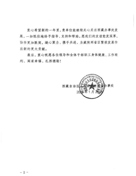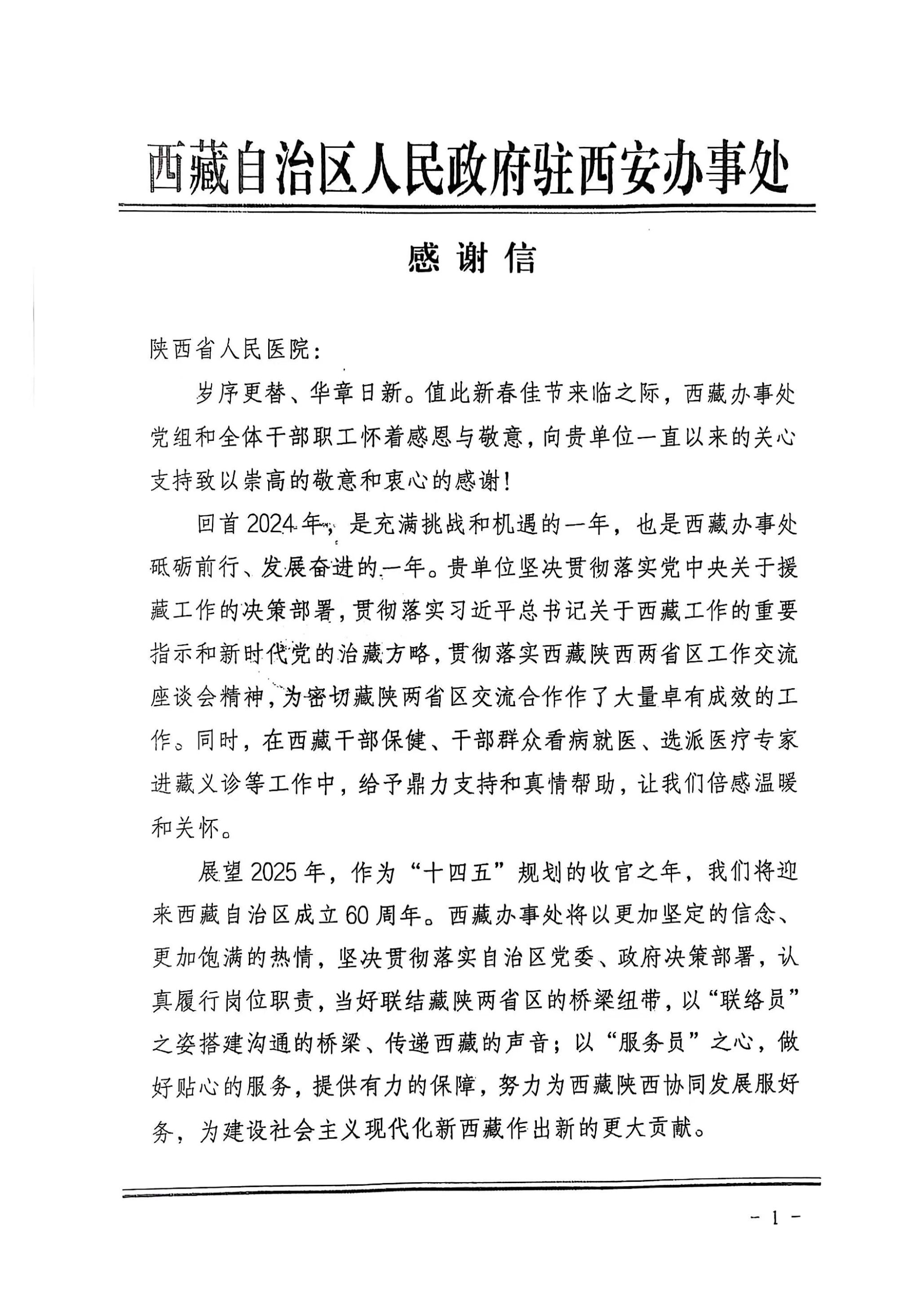 编者按:1月27日,西藏自治区人民政府驻西安办事处向三级片 发来感谢信,对三级片 长期以来在西藏干部群众看病就医、医疗专家援藏义诊等工作表示衷心感谢。