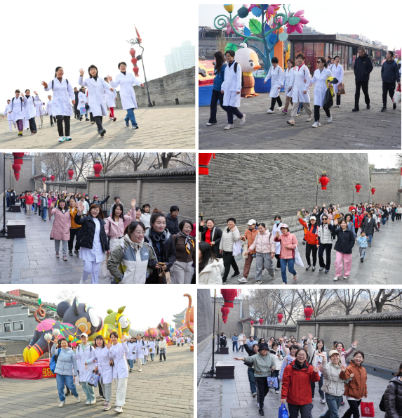 党委书记张玉莲和党委副书记张路带领着近200名身着象征使命白大褂的女职工,列队而立。随着张玉莲书记一声铿锵的“出发”,职工健步走活动正式拉开帷幕,13.4公里的环形路线徐徐展开,途经安定、安远、长乐、文昌四门。白衣队伍似灵动的丝带,蜿蜒前行,与古朴的青砖灰瓦相互映衬,共同勾勒出一幅动静相宜、饱含底蕴的流动画卷。这场职工健步走活动,女职工们用脚步探寻古城魅力,用心灵感悟生活真谛,也让医院的温暖关怀,深深烙印在每一个参与者的心中。一位青年女医生边走边感慨:“从前在手术室争分夺秒,今天终于能踩着晨光,听自己的脚步声和城墙的心跳同频。”