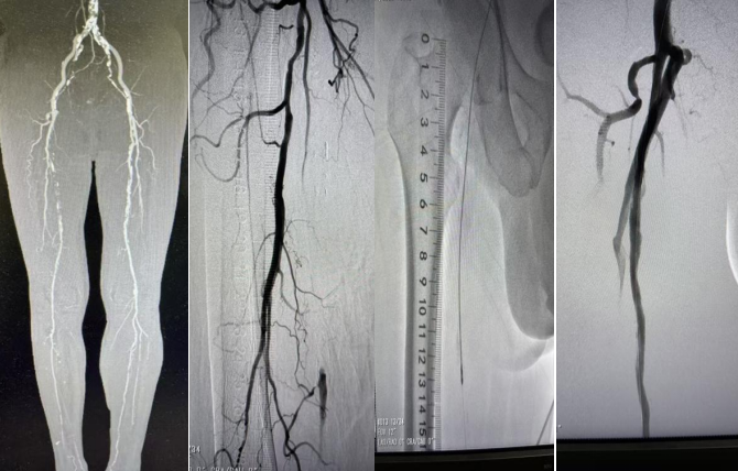 本例患者为老年男性,右足疼痛伴皮肤破溃2月,入院行CTA检查提示右侧股浅动脉长约23cm硬化闭塞。因右下肢缺血症状明显,如不及时处理存在肢体缺血坏死截肢风险,手术指征明确。术前在张瑞鹏主任指导下,医务人员积极完善相关术前检查,并组织了多次科内术前讨论,对手术方式、术中术后的风险及并发症等均制定了详细计划及预案,确保手术安全、顺利进行。本例手术难点在于患者动脉钙化严重,且闭塞管腔继发大量血栓,传统的减容设备难以同时处理钙化斑块及腔内血栓,不能很好地满足临床需要。经详细评估患者病情及征得患者及家属同意后,决定选用Jetstream血管斑块旋切导管减容设备,最终顺利完成手术。