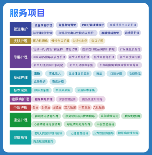为深入推进“互联网+护理服务”,医院领导班子高度重视,设立了延续服务中心,由2名经验丰富的护士专职管理,确保服务高效运作。护理部联合信息处、财务处、保卫处、党委办公室、院长办公室、医务处、法务处、耗材试剂部等,建立了多部门联动保障体系,配备了全程安全监控设备,搭建了医院-患者-护士三方联动的一体化服务平台,建立了15项精细化的服务流程和规范。全院各科室积极响应,经过严格的考核与培训,543名经验丰富的骨干护士组建成网约护士队伍,开设了涵盖基础护理、管道护理、皮肤护理、母婴护理以及康复指导等9大类55个服务项目,可充分满足不同群体的多样化需求,让行动不便的特殊人群足不出户就能享受到三级片