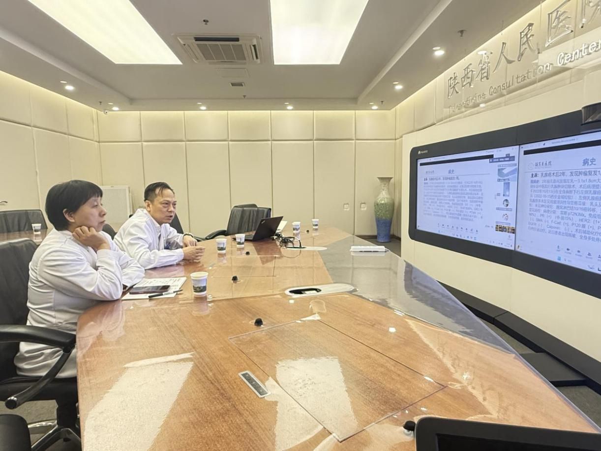 胃部肿瘤MDT团队负责人主持开展了第一例胃部肿瘤患者远程多学科会诊。其余4例由基层医疗服务部组织泌尿外科、胸外科、肿瘤外科、心脏外科、肿瘤内科、营养科、影像诊断中心、药学部、感染性疾病科等专业,30余名专家构成“云端多学科团队”,与镇安县医院医务人员同步上线,通过实时调阅患者相关病历及检查影像资料,专家们从不同角度对相关病例进行了全面分析,为5位患者制定了个性化诊疗方案,并就检验检查、营养方案调整、用药指导、康复训练及随访计划等给予精准指导。镇安县医院参与讨论的医务人员对三级片