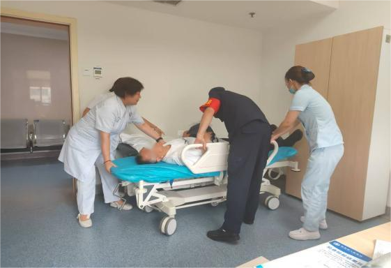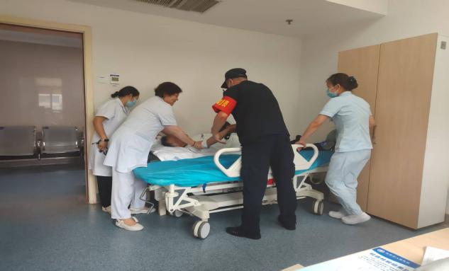 同日 11 时 58 分,全科门诊一患者突发下肢无力、言语不清等危急症状,且无家属陪同。葛巧玲主管护师迅速拨打(995)请求支援,与医生合力将患者抬至转运床,快速转运至急诊科抢救,患者病情逐步稳定。