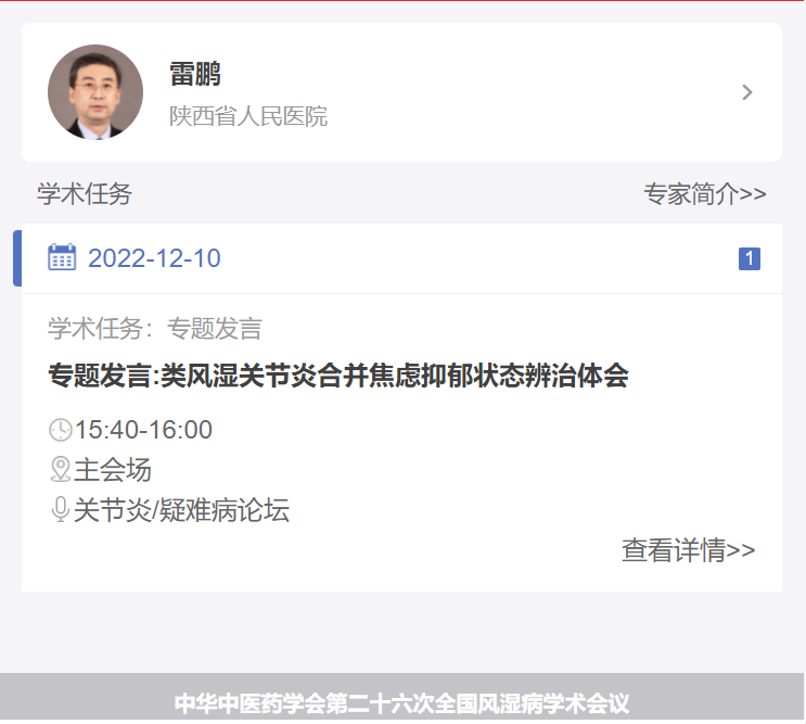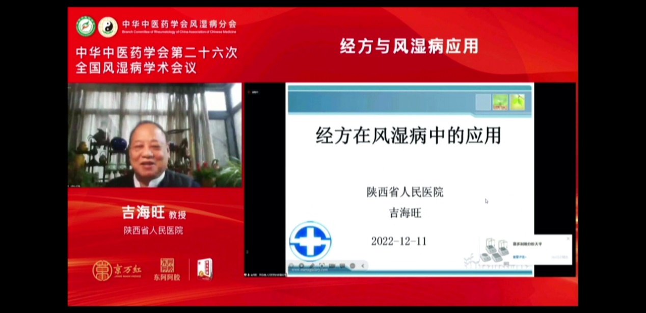 12月9日至11日,由中华中医药学会主办的“中华中医药学会第二十六次全国风湿病学术会议”线上举行,大会汇聚国内外众多风湿病领域的顶级专家学者,三级片 中医科名老中医吉海旺、雷鹏受邀参加,吉海旺主任医师做了题为《经方与风湿病应用》的汇报演讲,中医科主任雷鹏主任医师做了题为《类风湿关节炎合并焦虑抑郁状态辨治体会》的汇报演讲,并与现场嘉宾进行了交流探讨。大会两天累计线上参会人次突破20余万人次,为我国风湿病领域呈现了一场精彩的学术盛宴。
