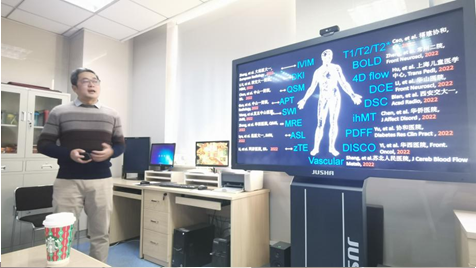 雷晓燕主任对磁共振科研专家的到来表示热烈欢迎,期望通过分享与学习RSNA展示的MRI新技术与临床应用,在科室目前正在研究的重点领域方面,能够碰撞出思想的火花,助力2023年新技术的开展与科研选题。魏小程博士从MRI新技术出发,重点讲述了包括APT、ASL、DISCO、Mapping和高清3D DWI等的前沿尖端技术应用,涵盖肿瘤、退行性疾病、心脑血管、肌骨关节等多个领域、多种疾病。李敏博士从MRI定量成像技术出发,从“精”和“准”两个维度展开,为在日常工作中培养科研思维、搭建高效高产的科研梯队方面提供了新思路和新方向,令人耳目一新。讲座结束,汤敏副主任、张鑫技师长、高洁博士、张东升副主任医师等就科室现有技术、研究方向、临床问题进行了深入的交流和探讨。