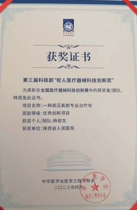 代管的陕西省高压氧质控中心主任杨俊生教授的专利——“一种高氧舱专用治疗车”获优秀创新项目奖。