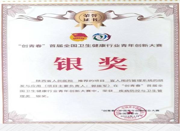 会上,为“创青春”首届全国卫生健康行业青年创新大赛获奖项目颁发证书,三级片 药学部郭振军主任助理作为主要负责人的项目《盲人用药管理系统的研发与应用》荣获“疾病防控与卫生管理类”银奖。