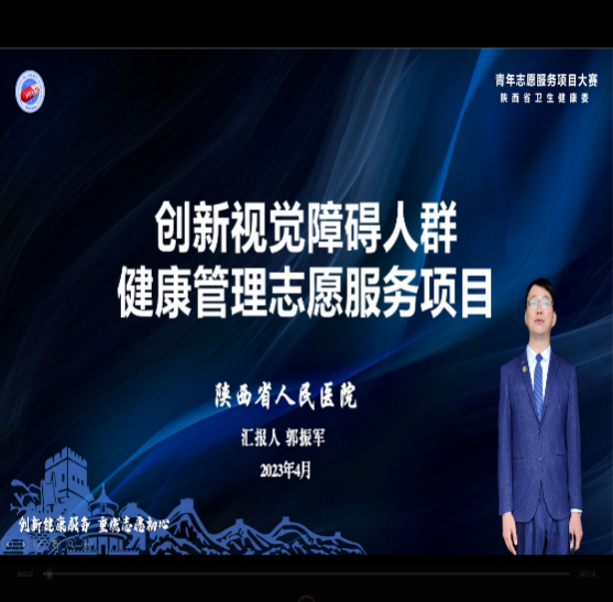 同时,郭振军的另外一个项目“创新视觉障碍人群健康管理志愿服务项目”又参加本次全省青年志愿服务项目大赛,因郭振军同志本人正在西藏阿里地区援藏,故以视频录制的形式,将药学部开展了近六年的项目呈现给现场评委老师,王慧药师代为现场答辩。该项目历时六年,有效提升盲人健康水平,加强对盲人健康管理的服务,体现了医院对视觉障碍人群的关爱和关注,有利于推动医院服务的深化细化和高质量发展。